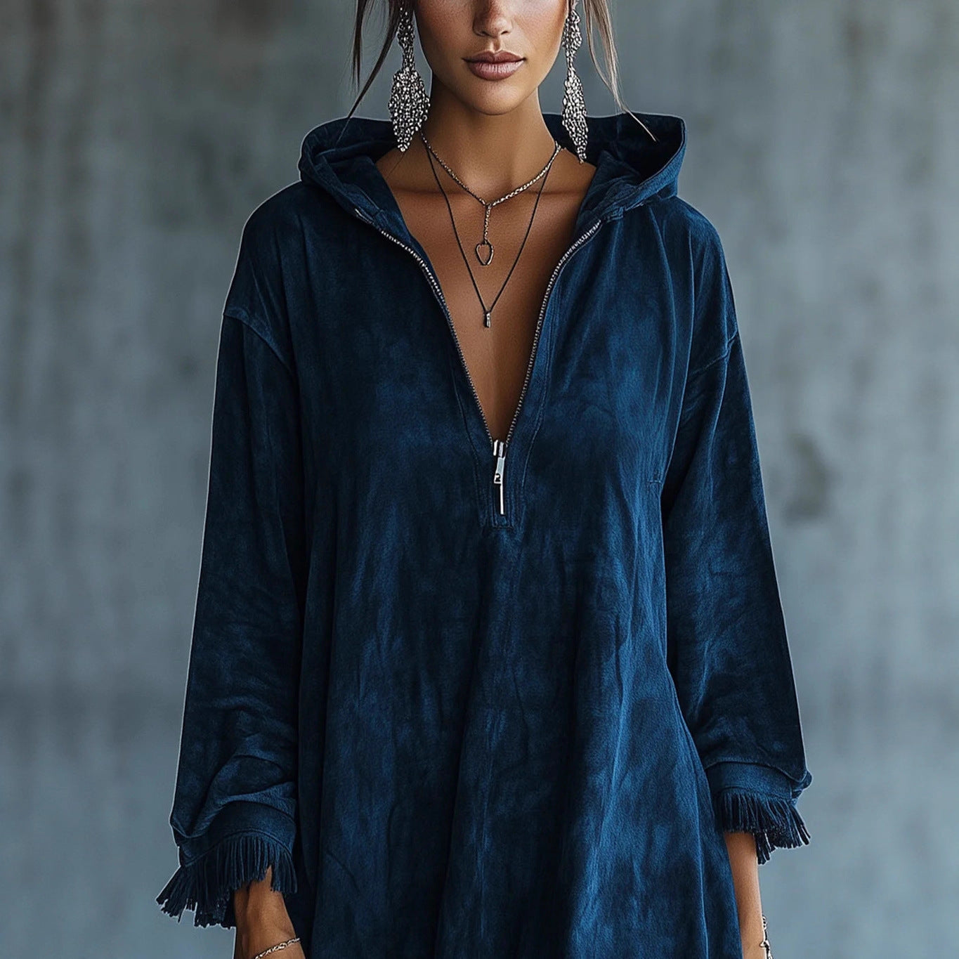O Vestido Folgado de Manga Comprida com Capuz combina conforto e um estilo descontraído com um toque moderno. O corte amplo garante liberdade de movimentos e uma sensação leve ao vestir, enquanto o capuz acrescenta funcionalidade e um ar urbano. Ideal para o dia a dia ou momentos de lazer, é uma peça versátil, prática e fácil de combinar, perfeita para quem valoriza conforto sem abdicar de um visual actual e elegante.